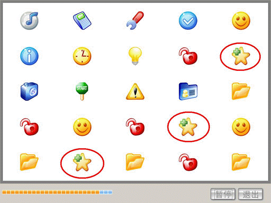 注意整个过程中,视点应始终放在屏幕的中间,尽量不要转动眼球。用眼睛的余光来辨别要找的图片。在开始练习的时候你可能无法看清所有的目标图片,但即便是这样也不要随意转动眼球,而是努力地进行整体辨认。只要经过不断的练习你一定能增强自己的视感知能力,有效扩大自己的有效视幅范围的。